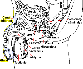 testicules et stockés dans les épididymes. À l'occasion d'une stimulation sexuelle, les spermatozoïdes se mélangent avec un liquide produit par les vésicules séminales et la prostate pour former le sperme, qui, lors de l'éjaculation, passe dans l'urètre et sort par un orifice, ou méat, situé à l'extrémité du pénis en érection. Une fois le sperme déposé dans le vagin de la femme, les spermatozoïdes remontent dans l'utérus jusque dans la trompe de Fallope, où l'un d'entre eux pourra féconder l'ovule pour donner un zygote (oeuf fécondé). Testicules Les testicules sont les principaux organes de la reproduction de l'organisme masculin. Ils assurent la production des spermatozoïdes et leur stockage dans les épididymides jusqu'à l'éjaculation. Les testicules ont la forme d'un oeuf d'environ 2,5 centimètres de large et 3,8 centimètres de long. Les testicules sont situés à l'extérieur de la cavité abdominale, et sont protégés par une poche cutanée appelée scrotum. Cette position leur permet de rester à une température légèrement inférieure à celle du corps, condition indispensable à la formation de spermatozoïdes viables. ![]() Les épididymes sont des canaux longs et fins dont la fonction est le stockage des spermatozoïdes nouvellement formés. Ils sont situés dans le scrotum, le long de chaque testicule. Les spermatozoïdes demeurent dans ces épididymes en forme de corde jusqu'au moment de l'éjaculation, lorsqu'ils sont éjectés dans le canal déférent. Prostate La prostate est composée de muscles lisses et de tissu glandulaire. Elle entoure la partie initiale de l'urètre, juste au-dessous de la vessie. D'un diamètre d'environ 38 millimètres, la prostate sécrète un liquide clair qu'elle déverse dans l'urètre au moment de l'excitation sexuelle. Ce liquide alcalin précède les spermatozoïdes et permet de réduire l'acidité des sécrétions vaginales afin qu'elle ne provoque pas la destruction des spermatozoïdes. Vésicules séminales Les vésicules séminales assurent la sécrétion d'un liquide entrant dans la composition du sperme, lorsque les spermatozoïdes passent dans le canal déférent. Les deux vésicules ressemblent à de petites poches bulbeuses situées juste au-dessus de la prostate. Canal déférent Le canal déférent est le prolongement étroit du canal de l'épididyme qui sert à conduire les spermatozoïdes de l'épididyme au canal inguinal et à la région vésicale, puis au cordon spermatique au canal éjaculateur. Canal éjaculateur Le canal éjaculateur est un petit tube situé juste au-dessus de la prostate. C'est là que se rejoignent les canaux déférents et les vésicules séminales. Il assure le transport des spermatozoïdes à travers la prostate vers l'urètre. Corps caverneux du pénis L'urètre part des vésicules séminales, traverse les corps caverneux du pénis et s'ouvre par le méat (orifice) urétral à l'extrémité du gland. Le corps caverneux est composé de tissus spongieux qui se remplit de sang au moment de l'excitation sexuelle. Lorsque le sang remplit ce tissu, le pénis s'agrandit et se durcit, processus que l'on appelle érection. L'érection facilite le transport du sperme dans le vagin de la femme lors de l'éjaculation. Gland du pénis Le gland est l'extrémité renflée du pénis. À son sommet se trouve le méat, ou orifice, urétral, d'axe vertical. Le gland est recouvert d'un repli cutané lâche appelé prépuce que l'on excise souvent chez les nouveau-nés pour des raisons sanitaires ou religieuses. L'ablation du prépuce est connue sous le nom de circoncision.